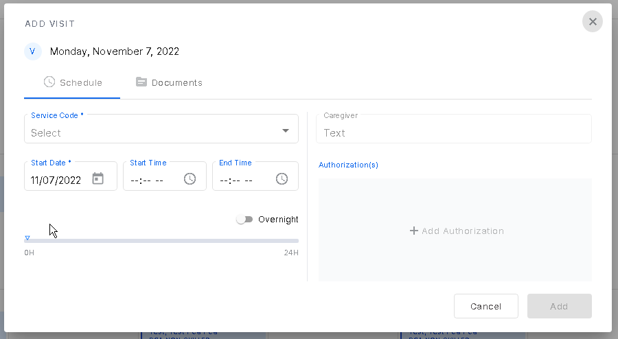 In the case that the patient has an overnight visit that needs the authorization to be split by billing date, edit the visit, add the authorization and click the check box that says "split authorization by billing date". The system will split the hours from the remainder of the visit start date and the remaining hours on the visit end date.