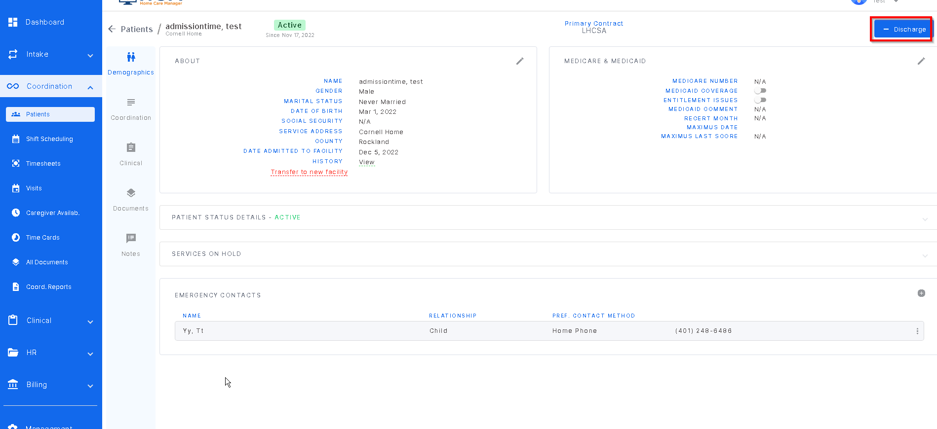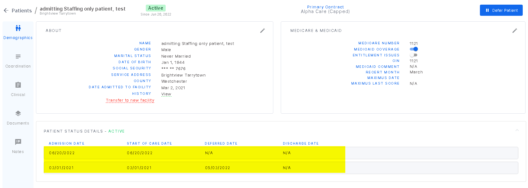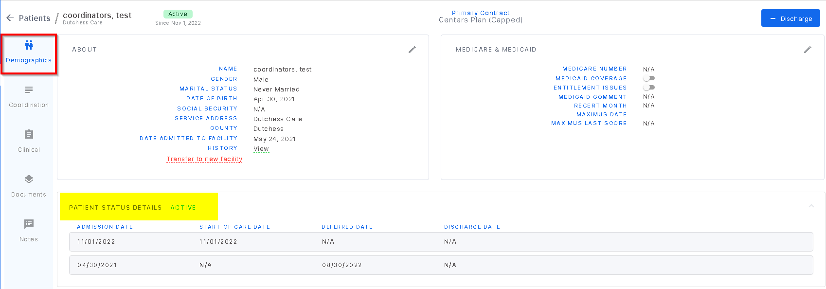 The Patient Status Details section lists every status the patient had and currently has. These include Active, Deferred, and Discharged. The start and end dates for all will also be listed here.