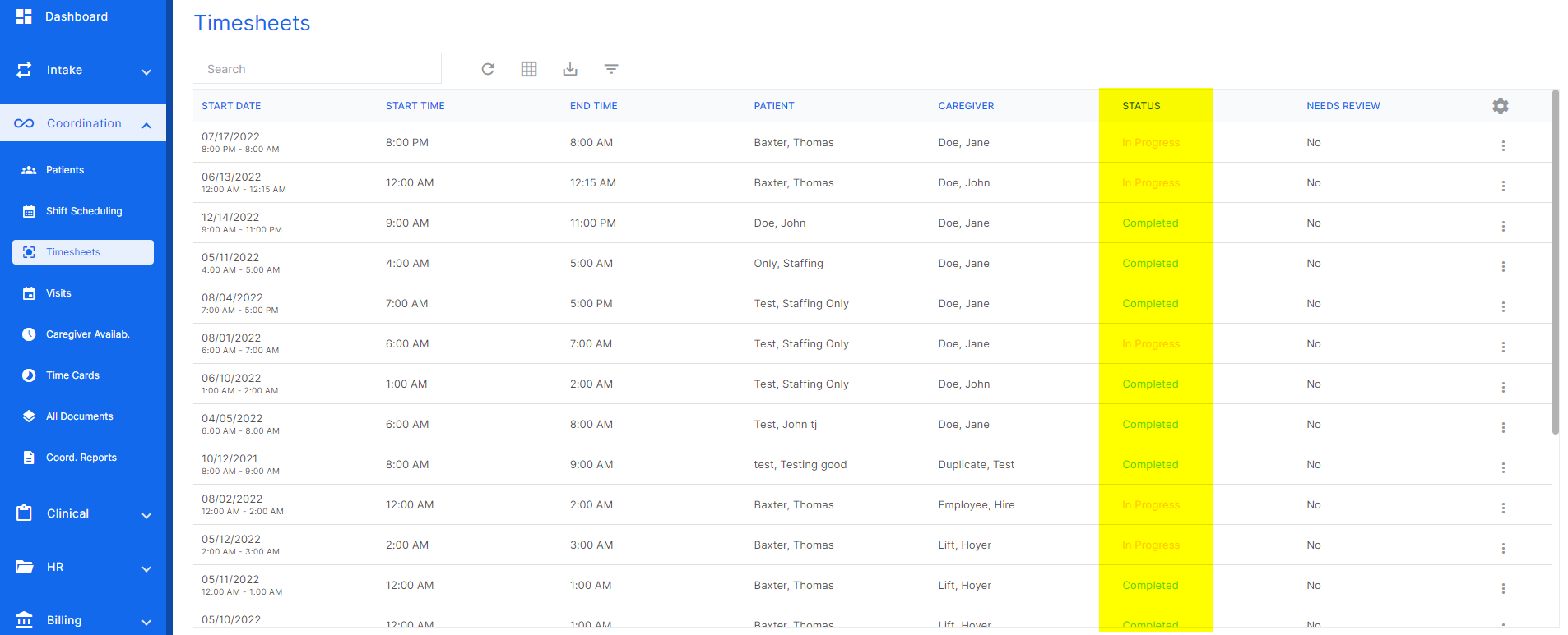 An in-progress e-timesheet is a duty sheet that is incomplete. A user can view an in-progress e-timesheet to see what tasks are incomplete so they can counsel the aide on what needs to be completed. The status of a timesheet can be found in the timesheets list in the highlighted column below.