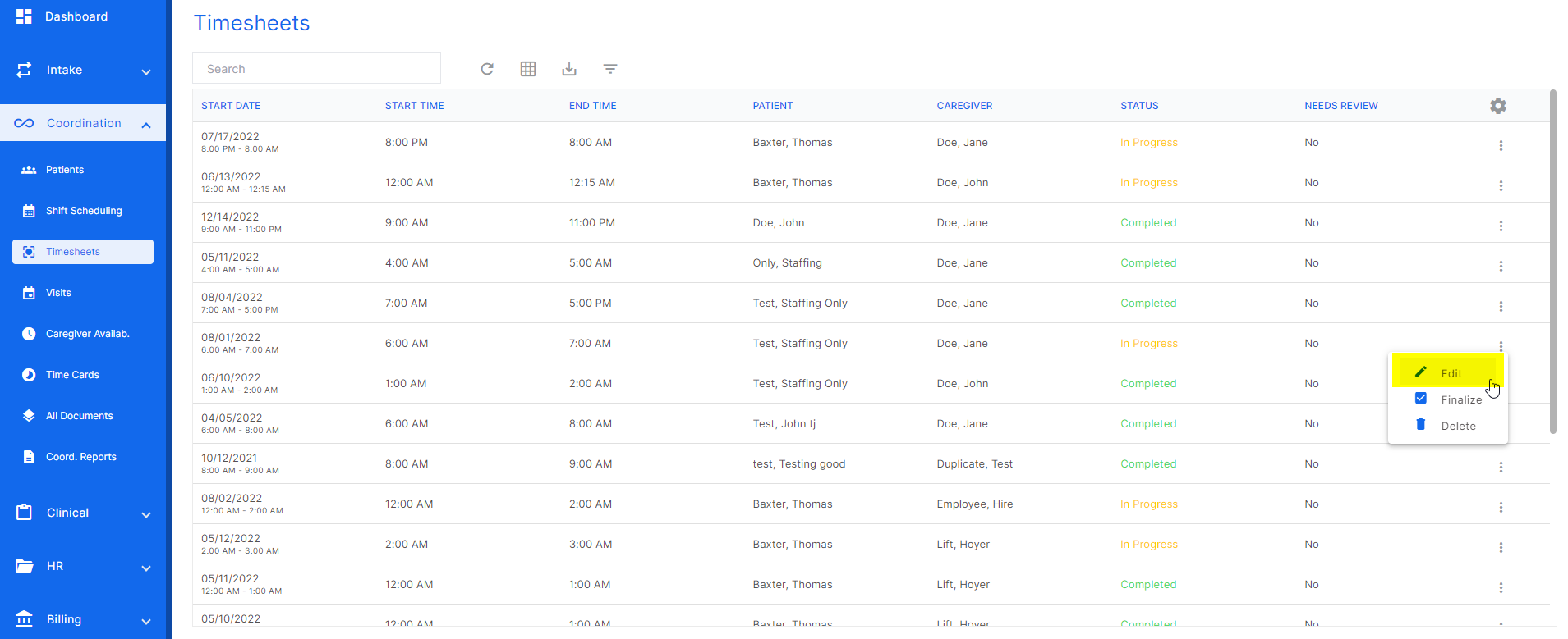 To view the in-progress e-timesheet, click the three dots at the end of the desired timesheet row and click "edit".