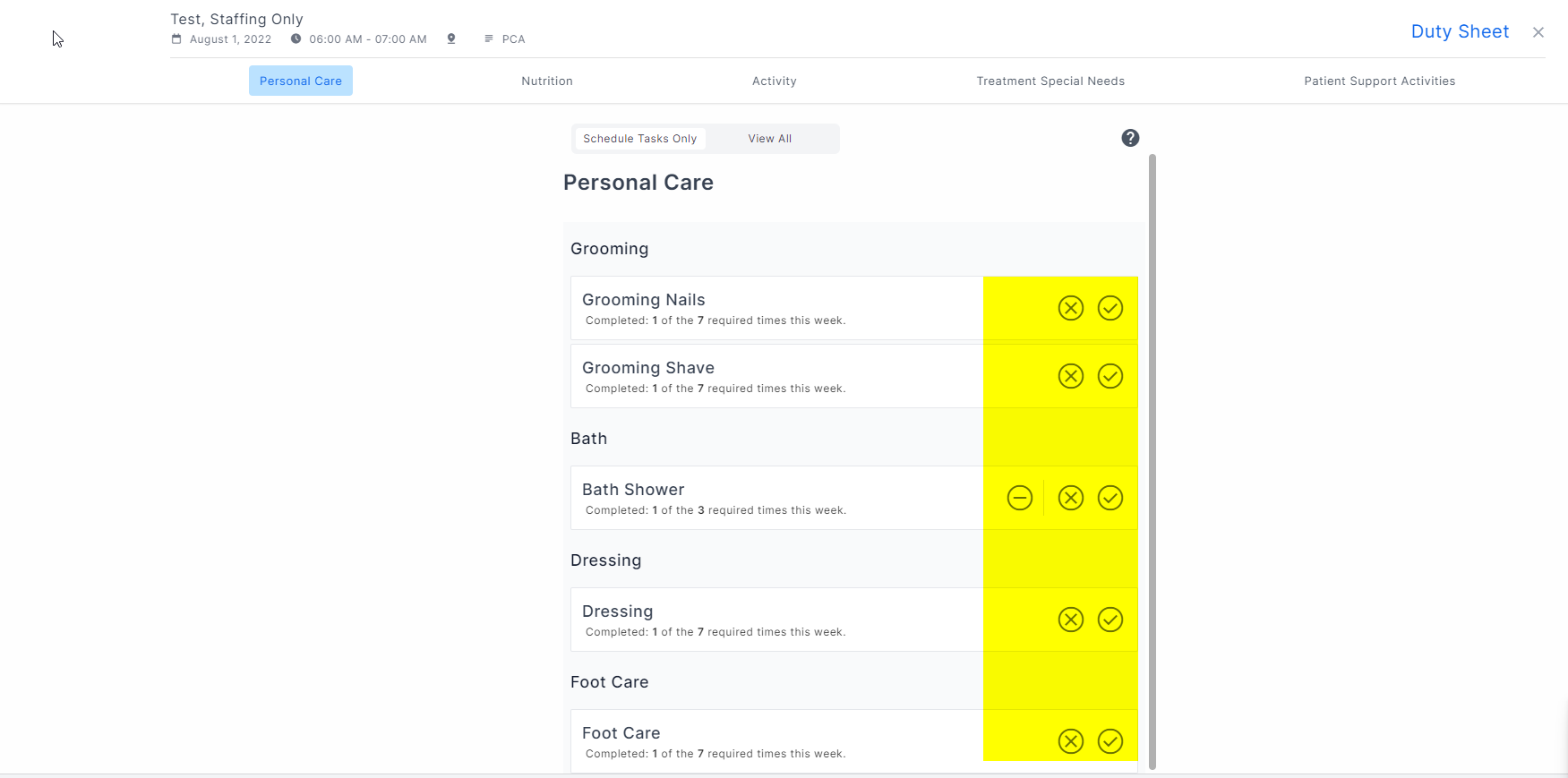 The highlighted area is where the task results are listed. If the tasks does not have a result, that means the aide did not enter a result for that task. An e-timesheet can't be completed until all required tasks have a result.