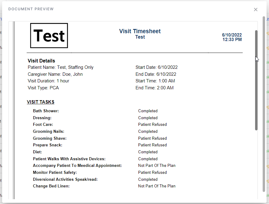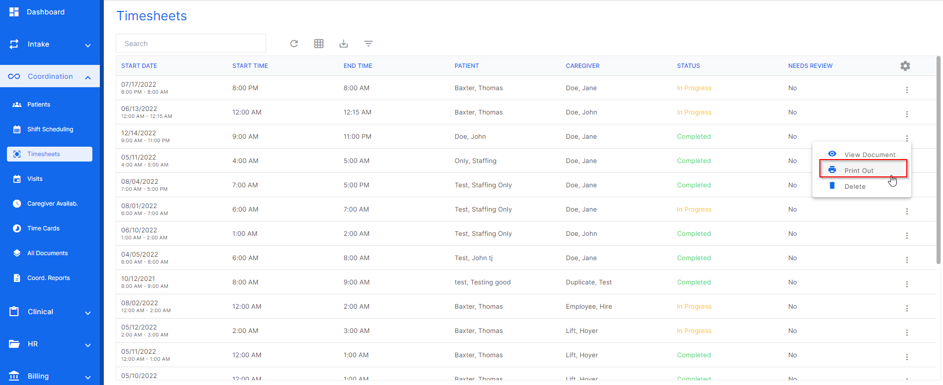 The next action for a completed timesheet is the print out action. Click the three dots at the end of the desired timesheet row and click "print out". The printable PDF will be printed out from the users linked printer to their computer.