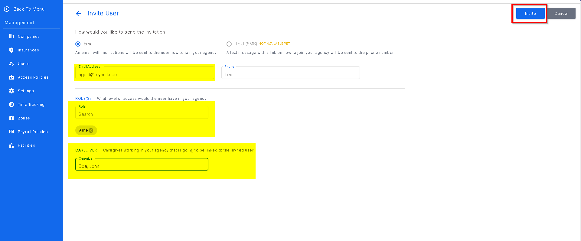 Caregivers will need to be invited to HCM from the Management tab by a user who has these permissions. Go to Management tab and click the drop down. Next, click Users and at the top of the page click Invite.